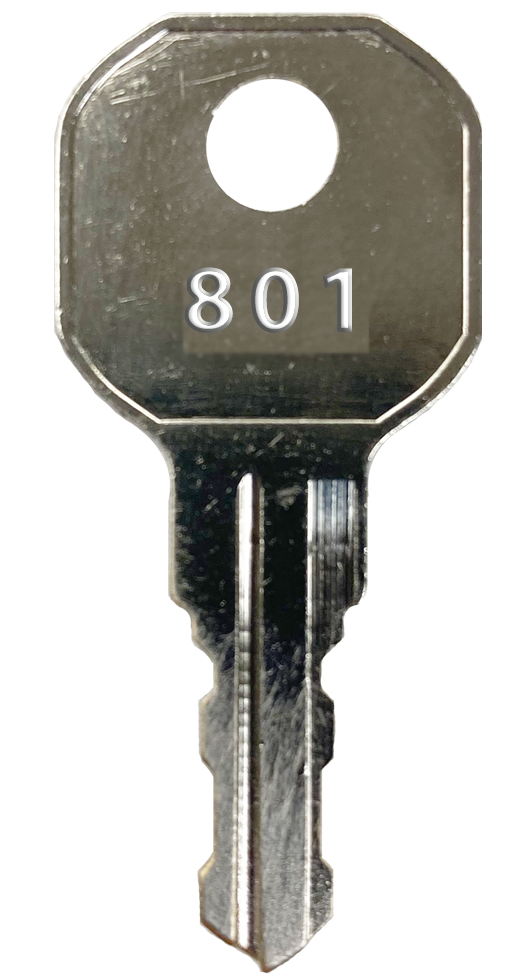 Replacement key for Kobalt tool chest and tool cabinet with 801 locks. Found on various tool chests available at Home Depot. Keys are designed to work on various locks that match the same number (ie: a 801 key will only work on a 801 lock). Found on various Kobalt, and Pro Steel tool boxers and tool chests. Available at Home Depot, Lowes, Menards, Sears, Target, Walmart, and more. Double-Sided Cut Key.